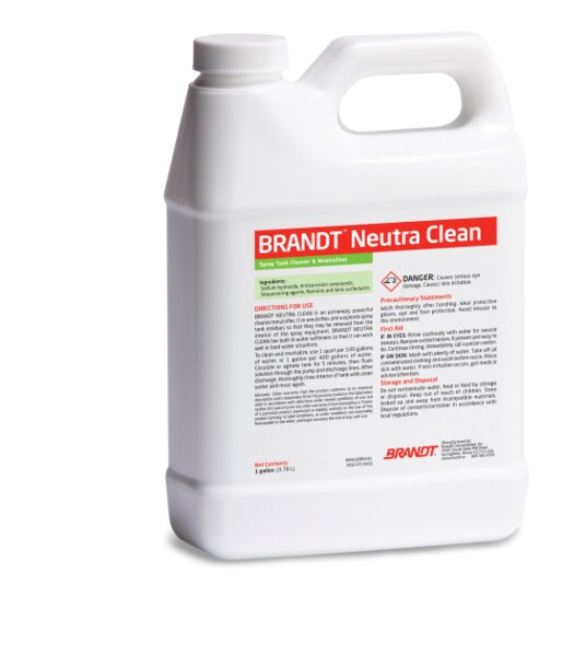 Brandt Neutra Clean is an extremely powerful cleaner/emulsifier. It re-emulsifies and suspends spray tank residues so that they may be removed from the interior of the spray equipment. Brandt Neutra Clean has built-in water softeners so that it can work well in hard water locations. It is non-toxic and non-flammable.